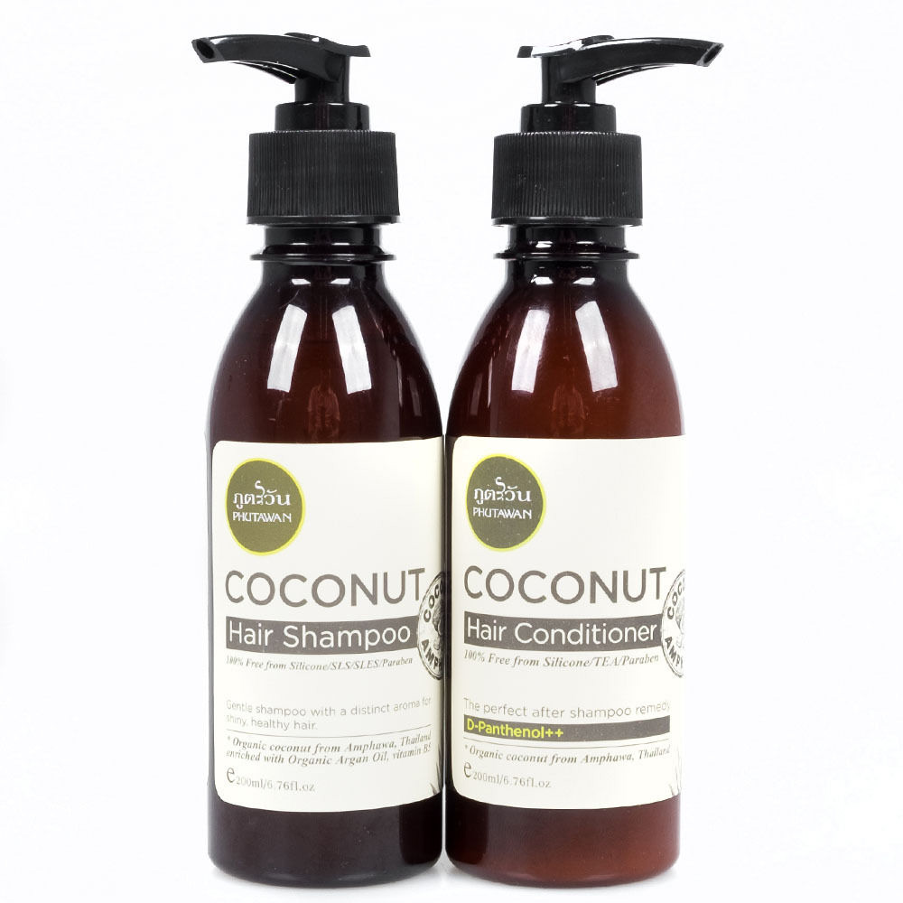 Phutawan Thai Coconut Hair Shampoo & Conditioner No Silicone Paraben Free 200 ml. Thailand